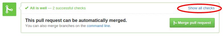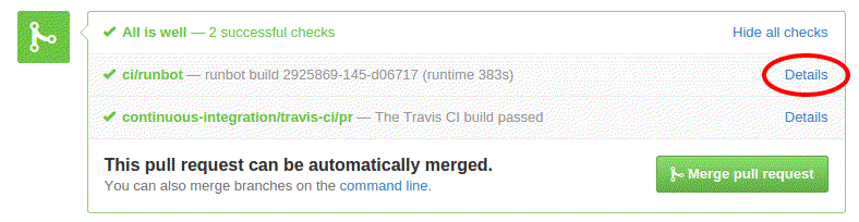 - At the bottom of a pull request, you will see the results of Runbot and Travis. Click on "Show all checks":