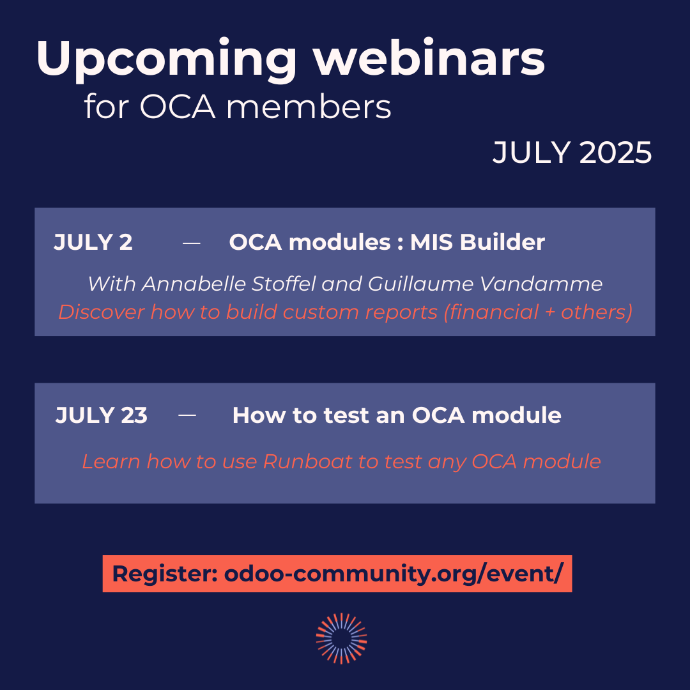 We have two  in July - OCA modules: MIS Builder and How to test an OCA Module.