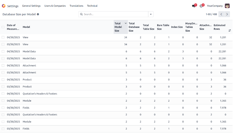 This is a great module to keep an eye on the development of the size of your Odoo instance over time. Every day, a snapshot will be taken with the full size of the database and the attachments. You can query these daily snapshots, and you can compare the current size with a size at any date of the past for which there is data.
