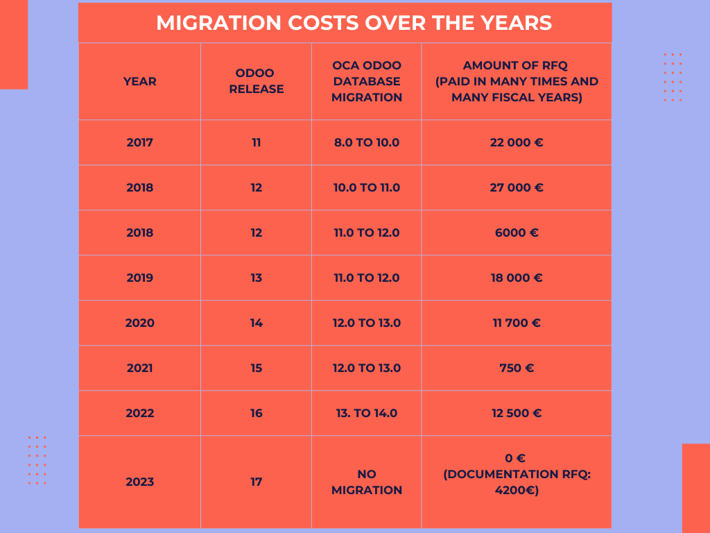 This was started in 2017 with the migration from version 8 to version 10. To migrate to version 12 and 13, it took more time so the money was spent over two years. The average migration cost is around 25.000€, as we can see here: