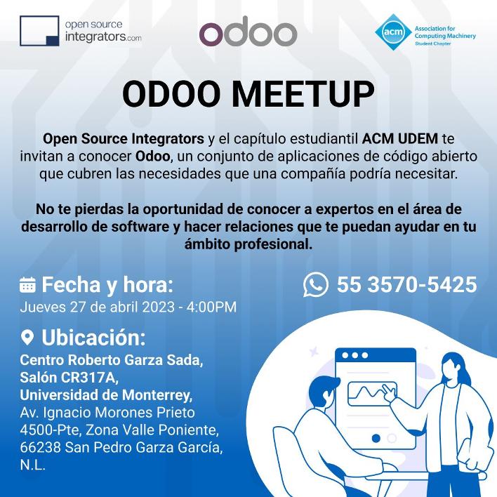 Open Source Integrators y el capítulo estudiantil ACM Universidad de Monterrey te invitan a su sesión mensual en donde conocerás Odoo, la plataforma de desarrollo en código abierto que está revolucionando la manera en que operan los sistemas empresariales.
