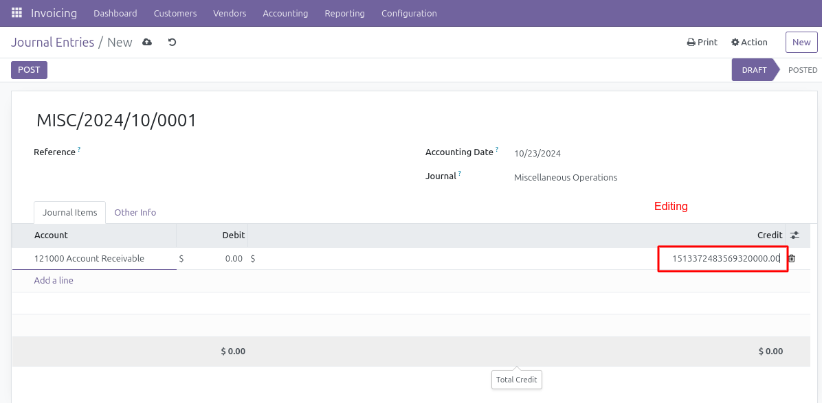 - Go to Invoicing/Accounting/Journal Entries