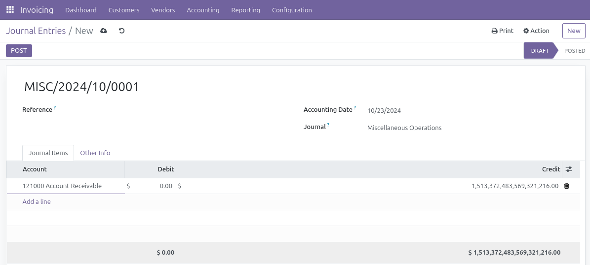 Hello, when trying to input very large numbers (with no decimals, 19 digits in my specific case) in credit or debit fields from journal items these numbers are changed on saving automatically with no explanation. The issue is easily reproducible in runbot Odoo 16 CE. I think a similar issue has been reported on github (https://github.com/odoo/odoo/issues/82597).