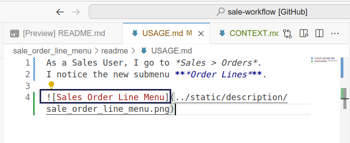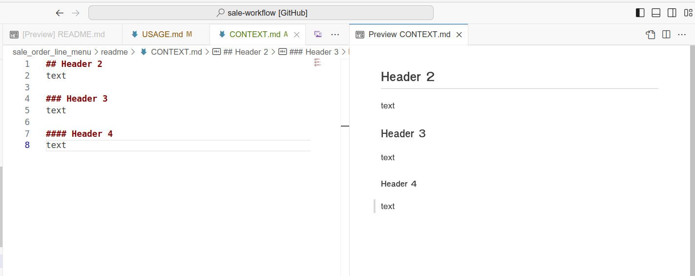 You cannot use the usual Markdown style Header 1 (#) because in Markdown it represents the main title and in OCA Readme fragments, the Header 1 title will be automatically generated by the OCA bot from the fragment’s names (for example “Usage” will be a 1 title in the final Readme).