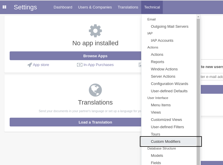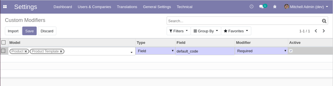 As system administrator, I go to Settings / Technical / User Interface / Custom Modifiers.