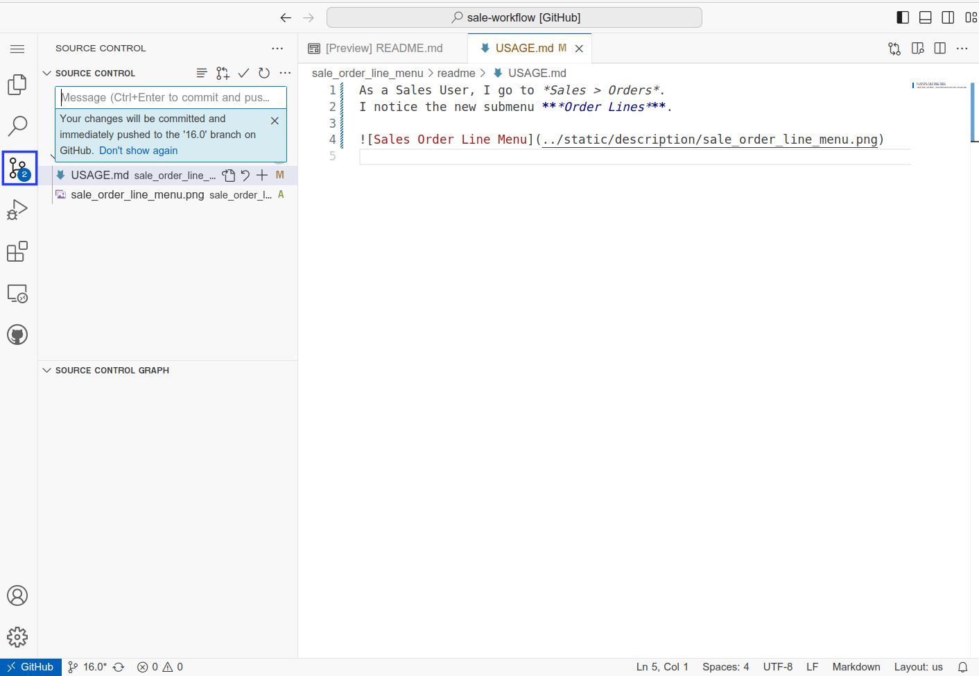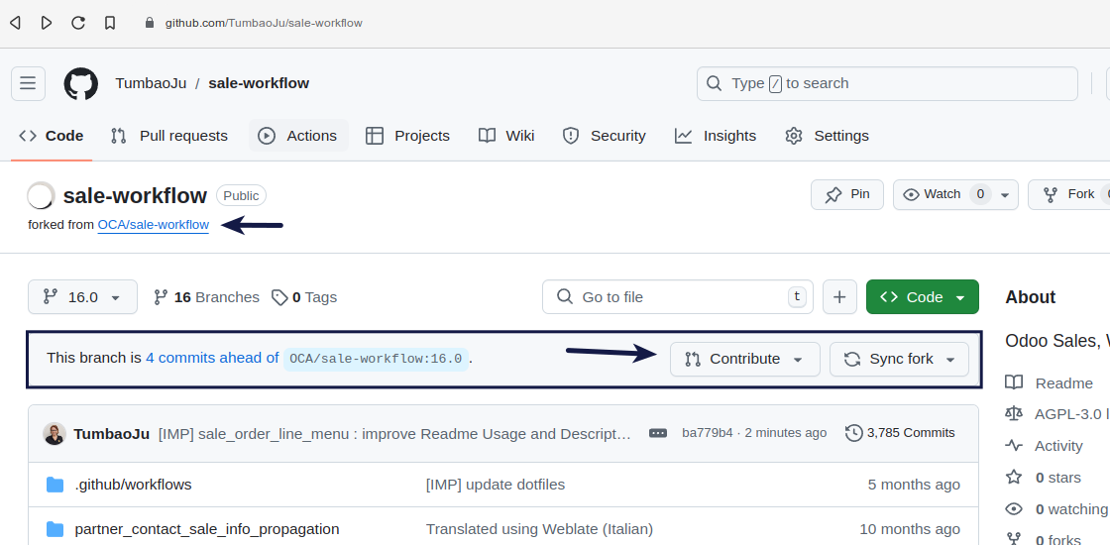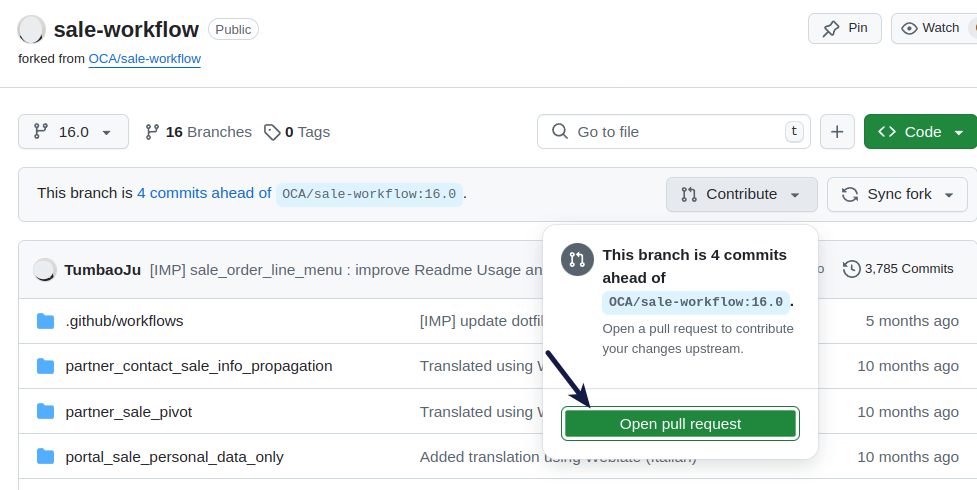 You can see a message regarding your commits. Click on the Contribute button to create your Pull Request and send your changes into the main branch.