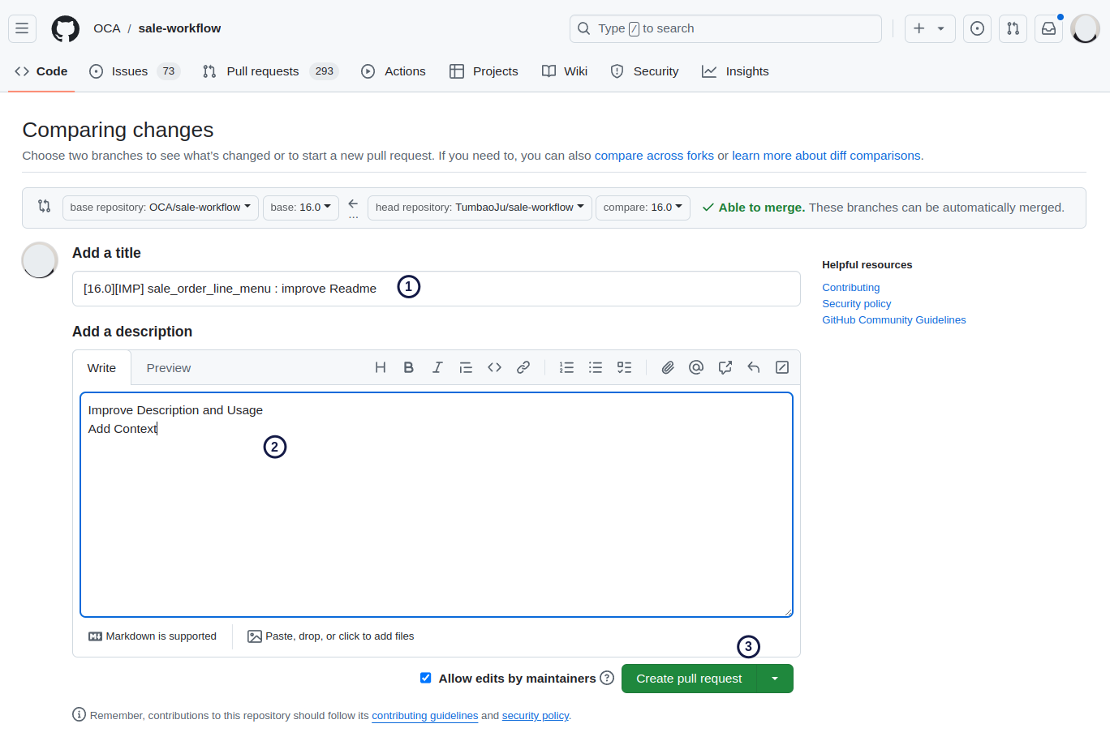 Add a title and description following the Commit Guidelines and click on the green button Create pull request.